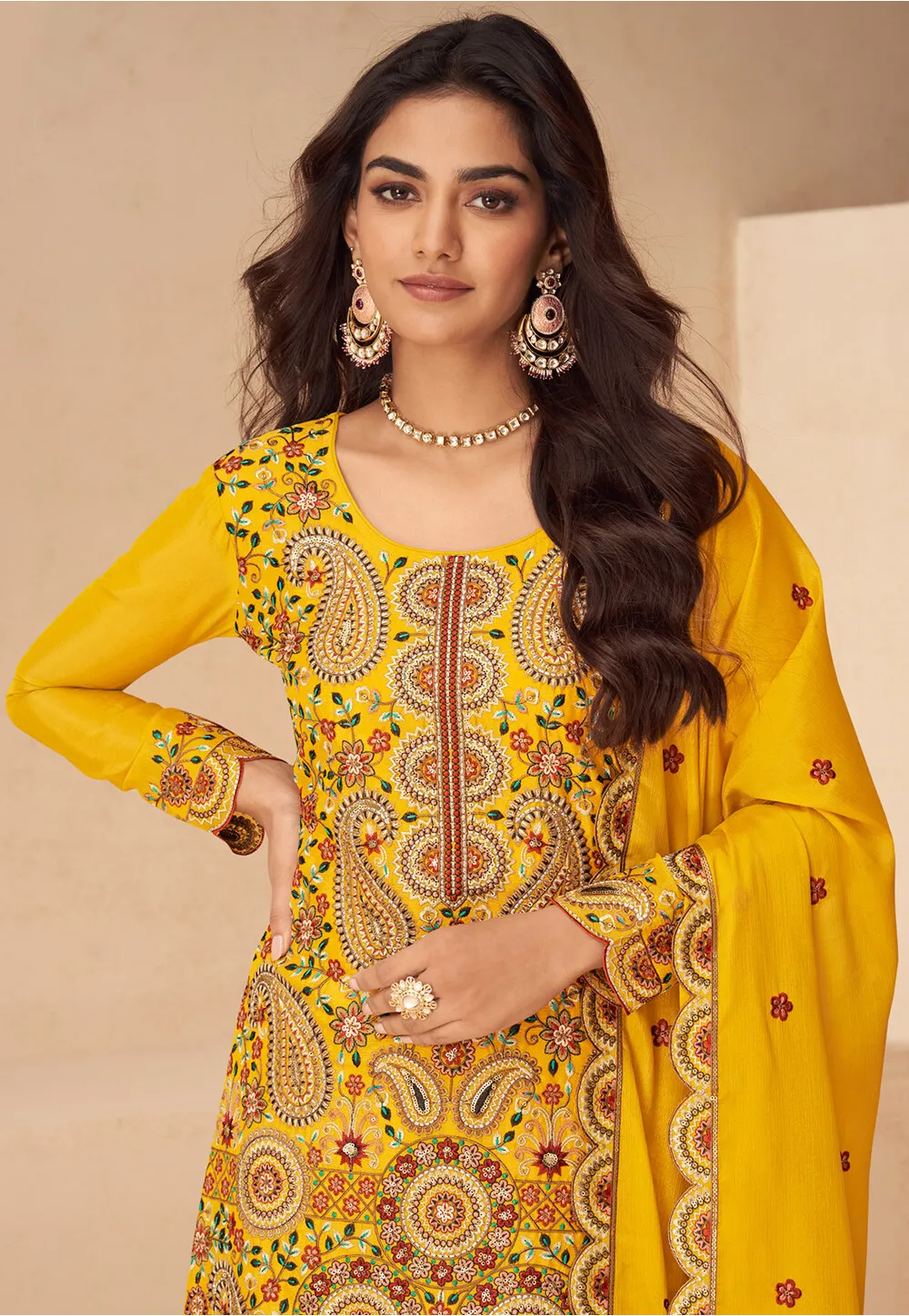 Embroidered Chinon Silk Scalloped Suit in Mustard